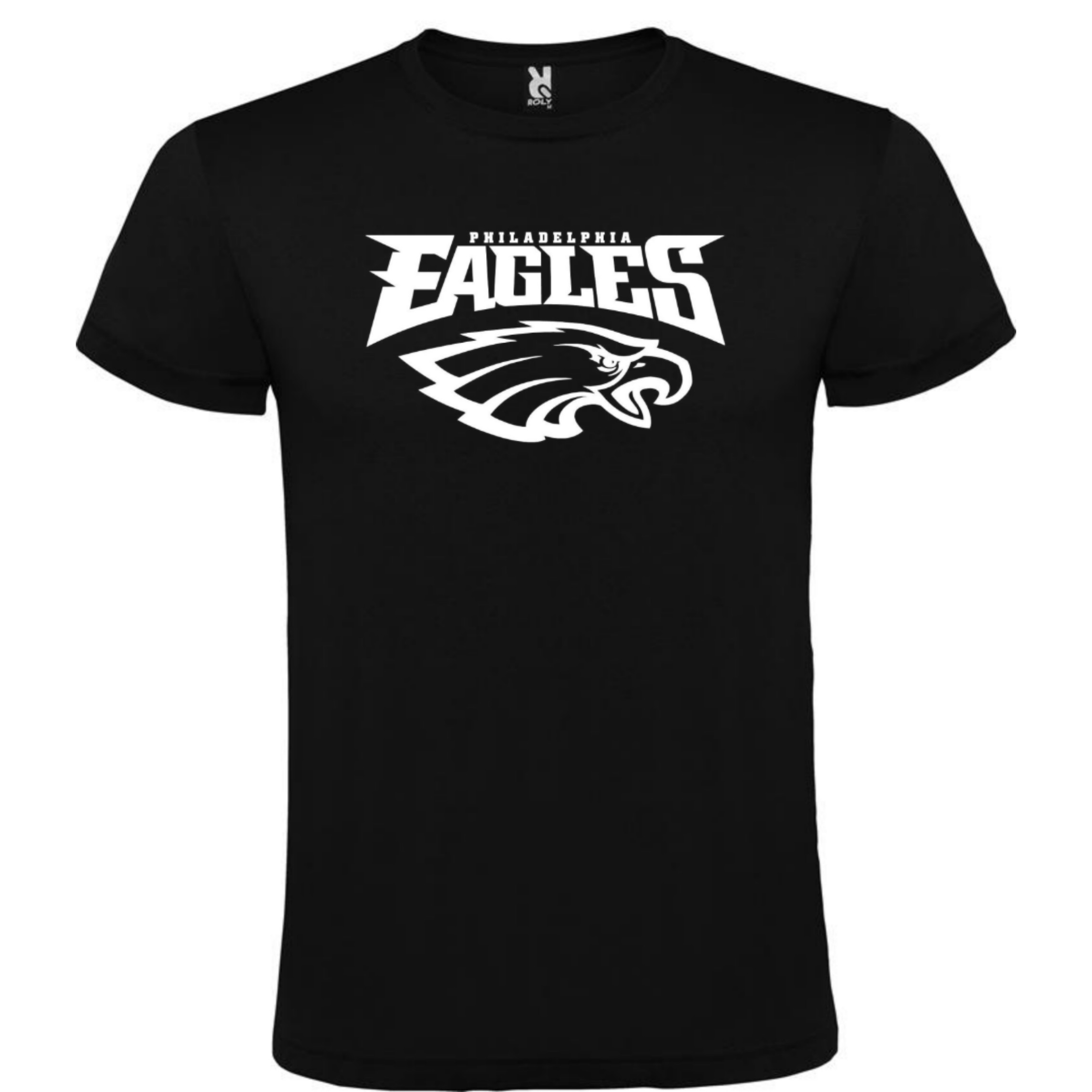 Camiseta negra con logotipo de Philadelphia Eagles. La camiseta de manga corta Beagle cuenta con elastano en el cuello y viene confeccionada en tejido tubular. Una apuesta de Roly por la comodidad y la suavidad.