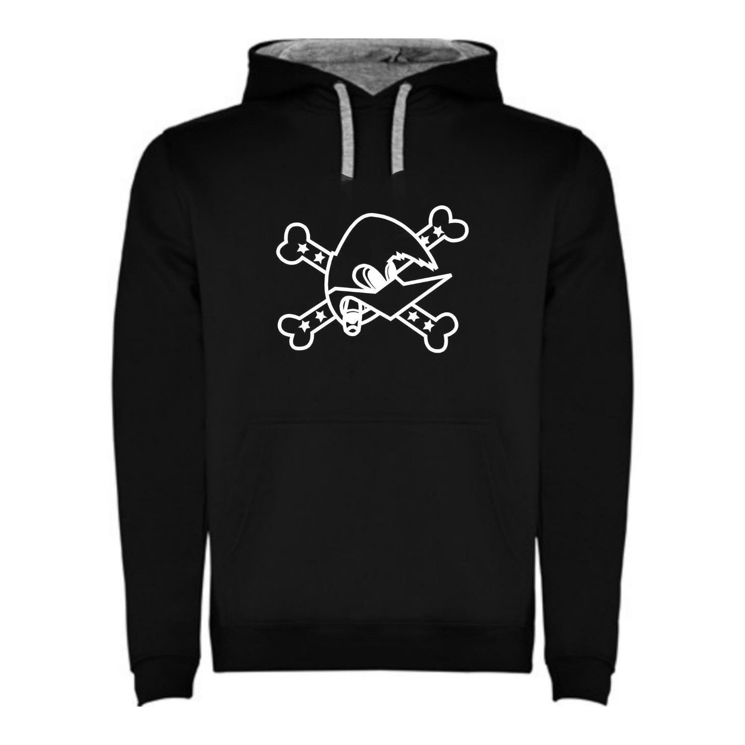 Sudadera con capucha Loquillo bicolor de doble tejido, con cordón contrastado ajustable, cubrecosturas en el cuello y bolsillo canguro. Punto canalé con elastano 1×1 en puños y cintura.