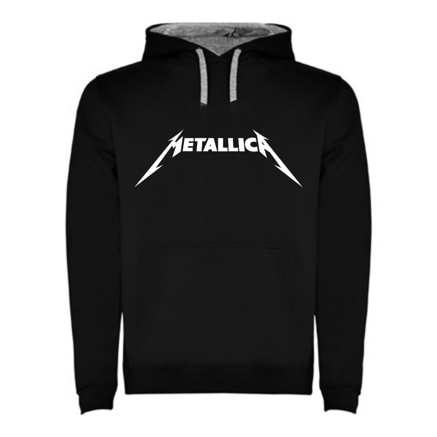 Sudadera con capucha Metallica bicolor de doble tejido, con cordón contrastado ajustable, cubrecosturas en el cuello y bolsillo canguro. Punto canalé con elastano 1×1 en puños y cintura.
